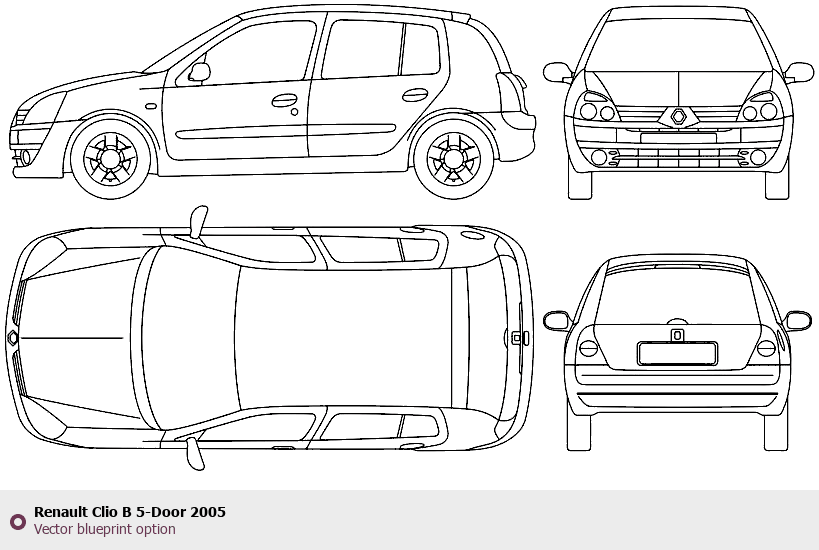 Raster blueprint of the 2005 Renault Clio B 5-Door Hatchback. This free downloadable image can be used for graphic projects, digital design, and 3D modeling. The file provides accurate exterior proportions of the vehicle. Model year: 2005. Body type: Hatchback.