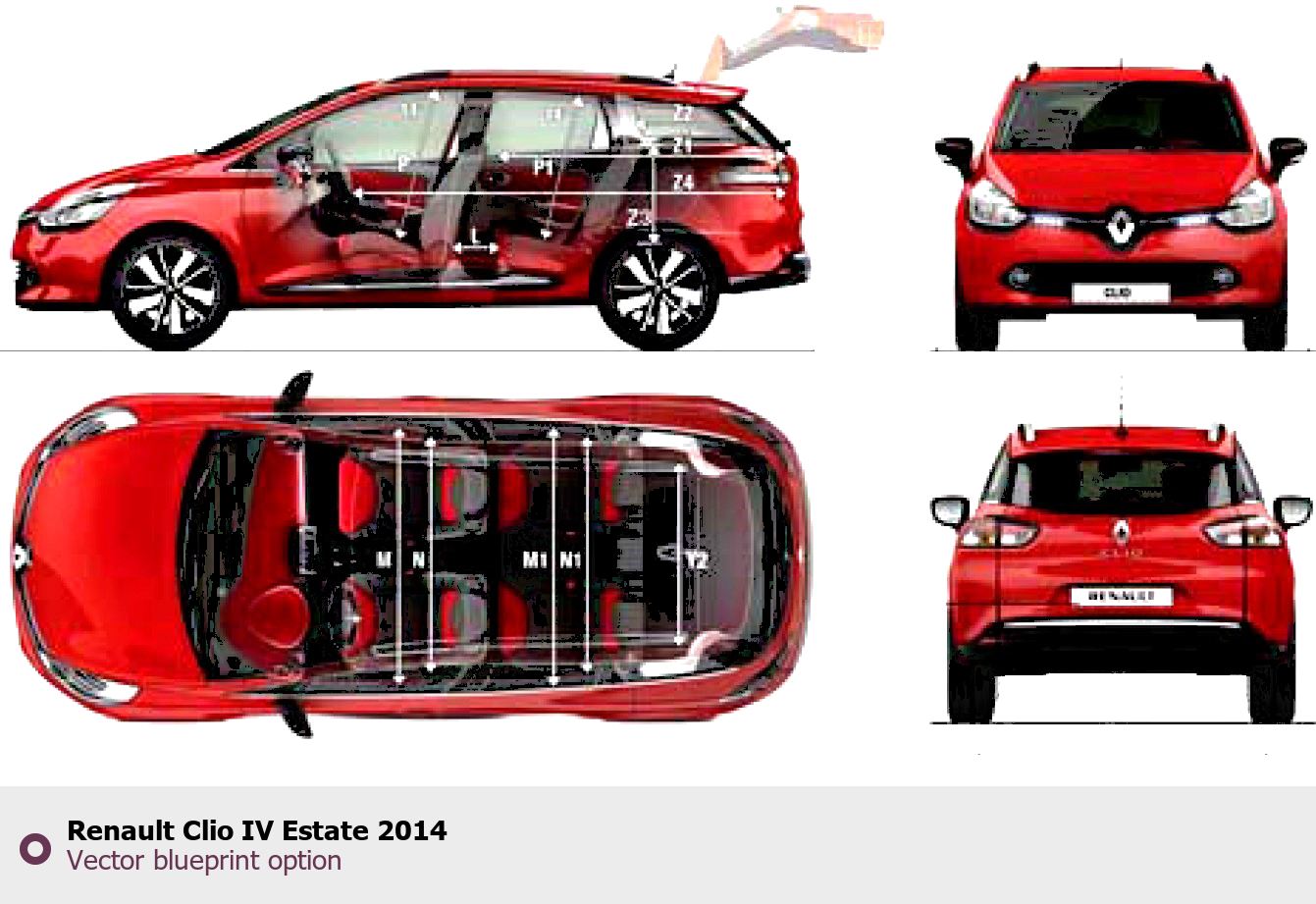 Raster blueprint of the 2014 Renault Clio IV Estate Hatchback. This free downloadable image can be used for graphic projects, digital design, and 3D modeling. The file provides accurate exterior proportions of the vehicle. Model year: 2014. Body type: Hatchback.