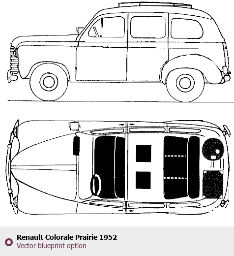 Raster blueprint of the 1952 Renault Colorale Prairie Sedan. This free downloadable image can be used for graphic projects, digital design, and 3D modeling. The file provides accurate exterior proportions of the vehicle. Model year: 1952. Body type: Sedan.