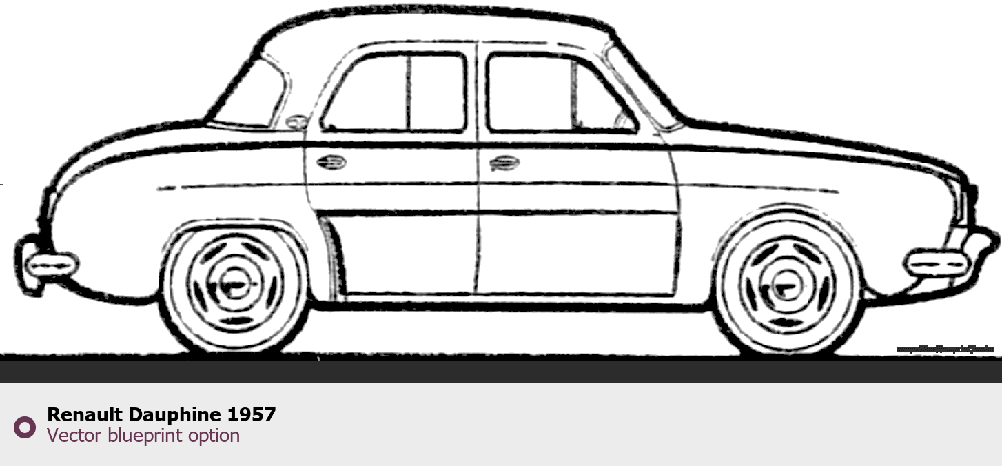 Raster blueprint of the 1957 Renault Dauphine Sedan. This free downloadable image can be used for graphic projects, digital design, and 3D modeling. The file provides accurate exterior proportions of the vehicle. Model year: 1957. Body type: Sedan.