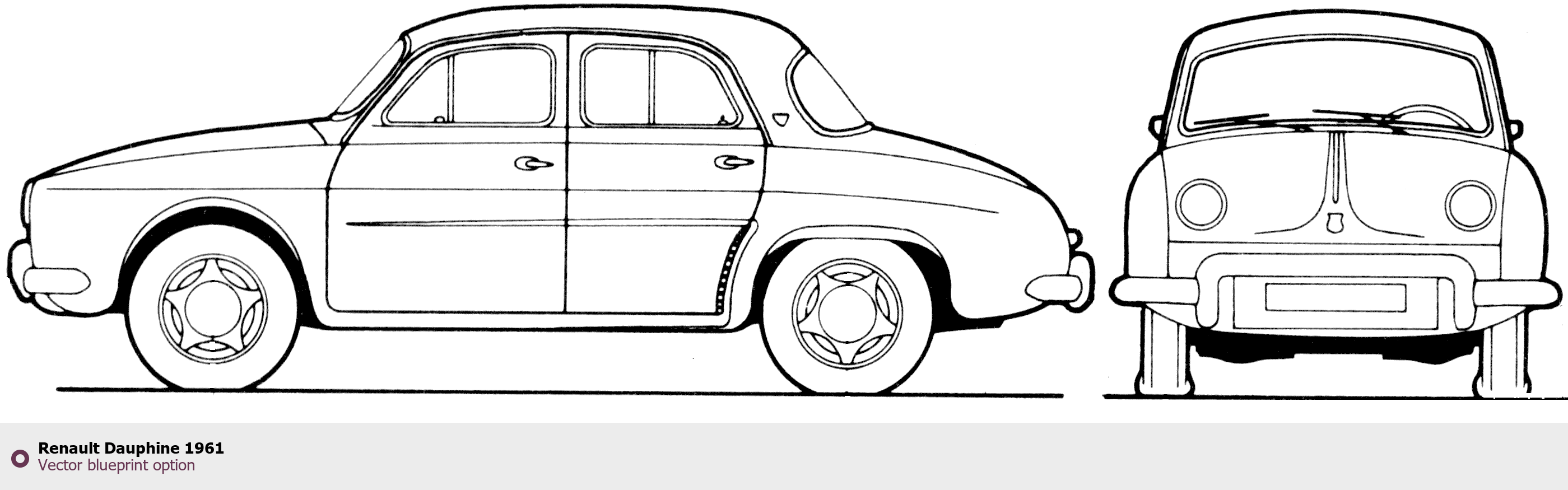 Raster blueprint of the 1961 Renault Dauphine Sedan. This free downloadable image can be used for graphic projects, digital design, and 3D modeling. The file provides accurate exterior proportions of the vehicle. Model year: 1961. Body type: Sedan.