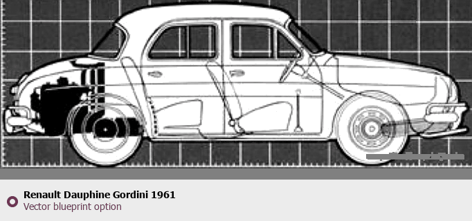 Raster blueprint of the 1961 Renault Dauphine Gordini Sedan. This free downloadable image can be used for graphic projects, digital design, and 3D modeling. The file provides accurate exterior proportions of the vehicle. Model year: 1961. Body type: Sedan.