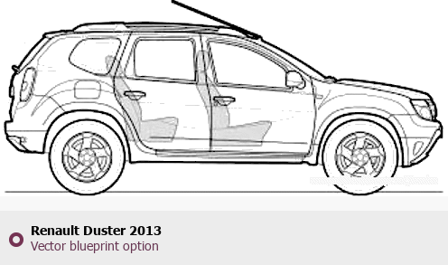 Raster blueprint of the 2013 Renault Duster SUV. This free downloadable image can be used for graphic projects, digital design, and 3D modeling. The file provides accurate exterior proportions of the vehicle. Model year: 2013. Body type: SUV.