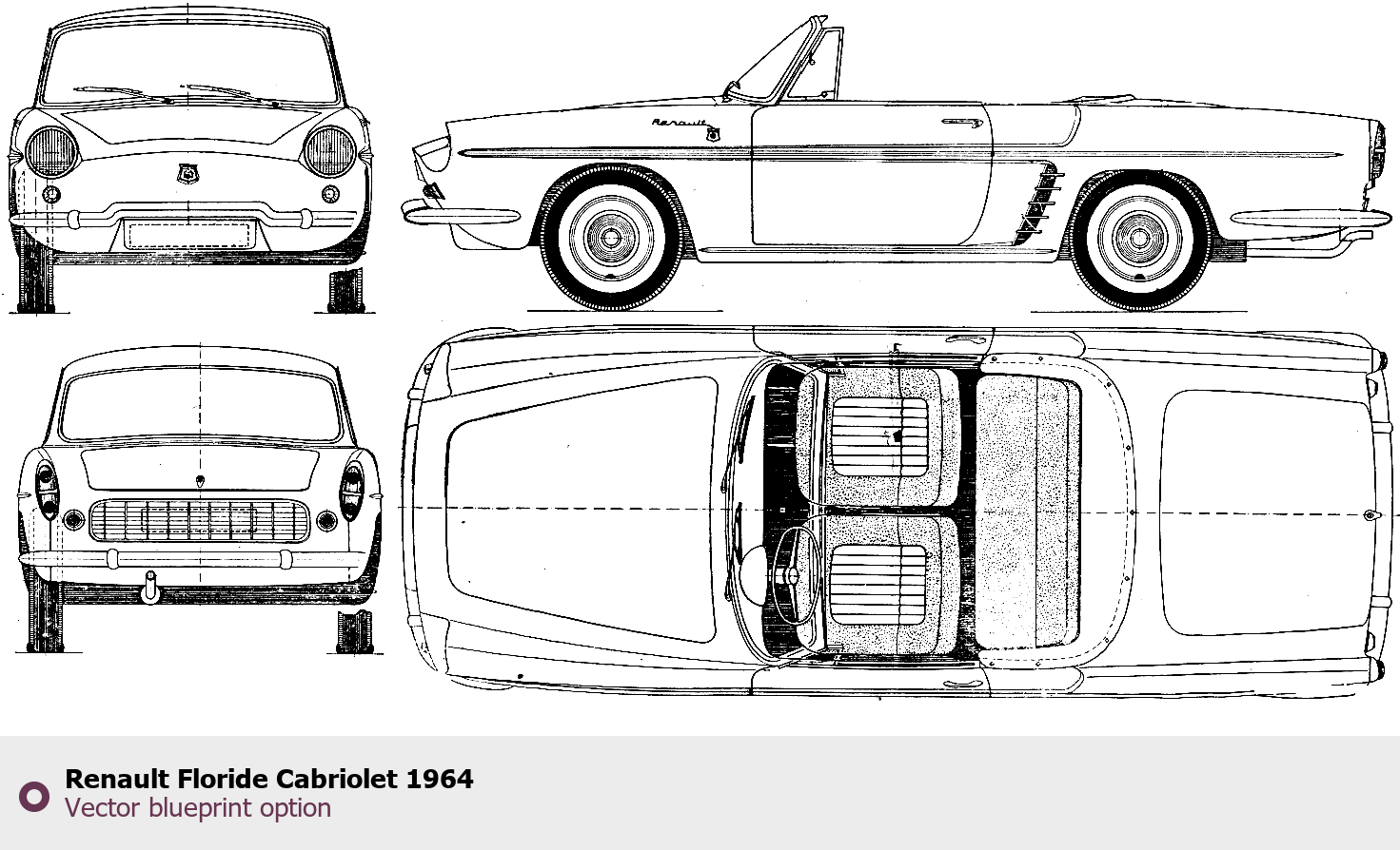 Raster blueprint of the 1964 Renault Floride Cabriolet Cabriolet. This free downloadable image can be used for graphic projects, digital design, and 3D modeling. The file provides accurate exterior proportions of the vehicle. Model year: 1964. Body type: Cabriolet.