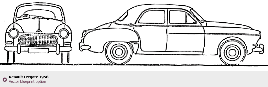 Raster blueprint of the 1958 Renault Fregate Sedan. This free downloadable image can be used for graphic projects, digital design, and 3D modeling. The file provides accurate exterior proportions of the vehicle. Model year: 1958. Body type: Sedan.