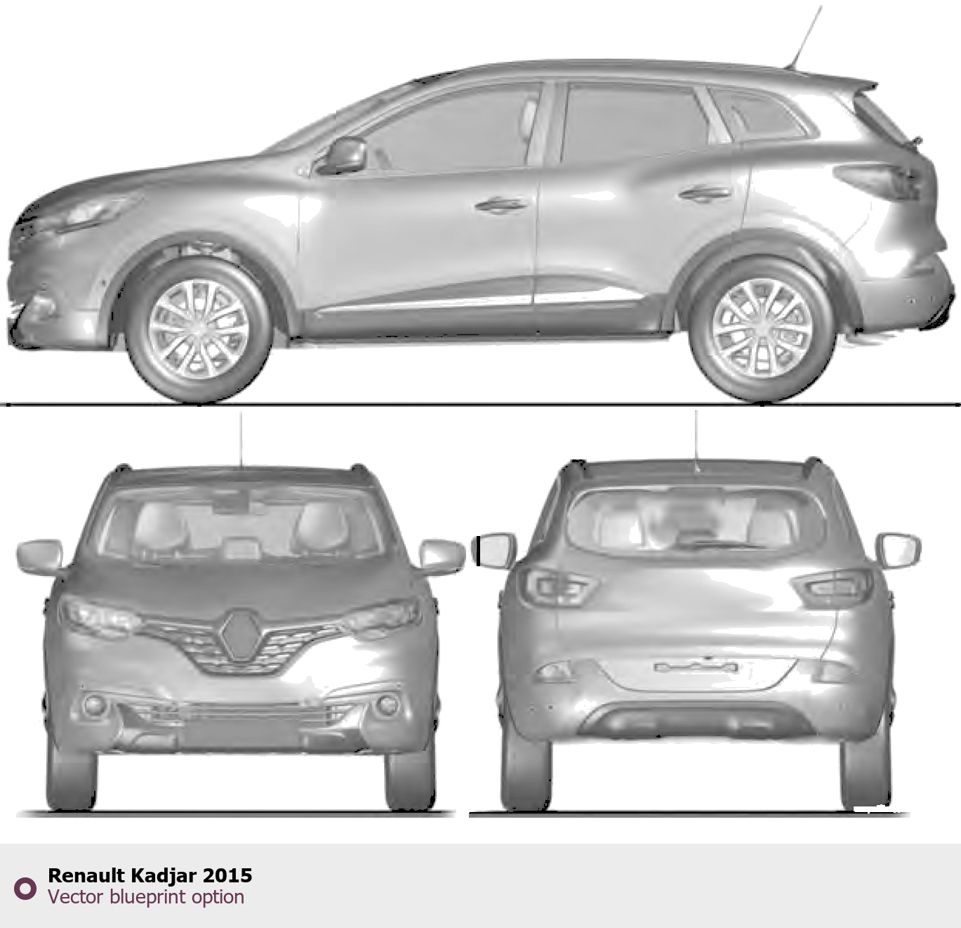 Raster blueprint of the 2015 Renault Kadjar SUV. This free downloadable image can be used for graphic projects, digital design, and 3D modeling. The file provides accurate exterior proportions of the vehicle. Model year: 2015. Body type: SUV.