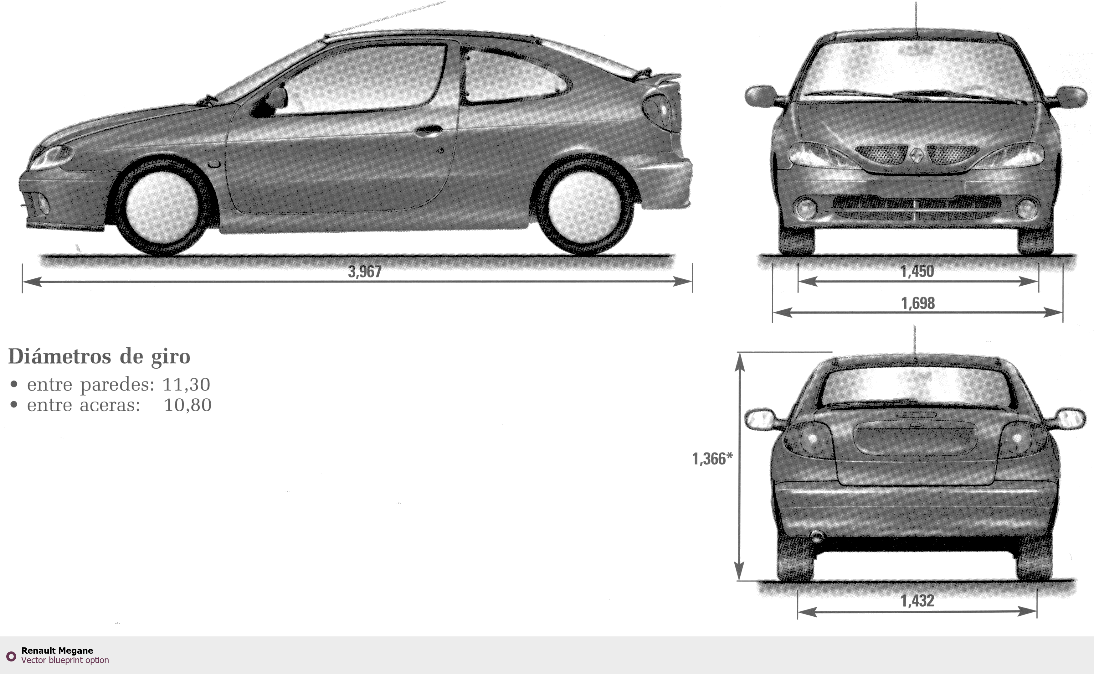 Raster blueprint of the Renault Megane Tag. This free downloadable image can be used for graphic projects, digital design, and 3D modeling. The file provides accurate exterior proportions of the vehicle. Body type: Tag.