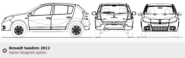 Raster blueprint of the 2012 Renault Sandero Hatchback. This free downloadable image can be used for graphic projects, digital design, and 3D modeling. The file provides accurate exterior proportions of the vehicle. Model year: 2012. Body type: Hatchback.