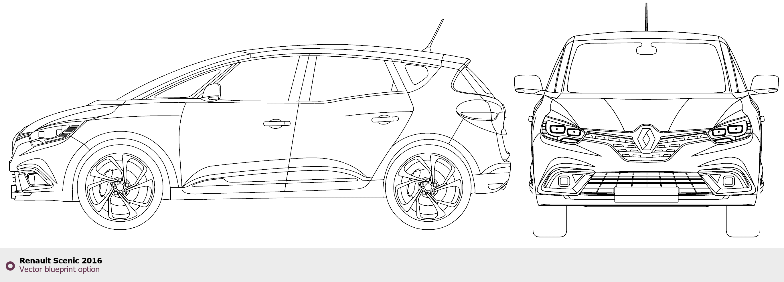 Raster blueprint of the 2016 Renault Scenic Minivan. This free downloadable image can be used for graphic projects, digital design, and 3D modeling. The file provides accurate exterior proportions of the vehicle. Model year: 2016. Body type: Minivan.