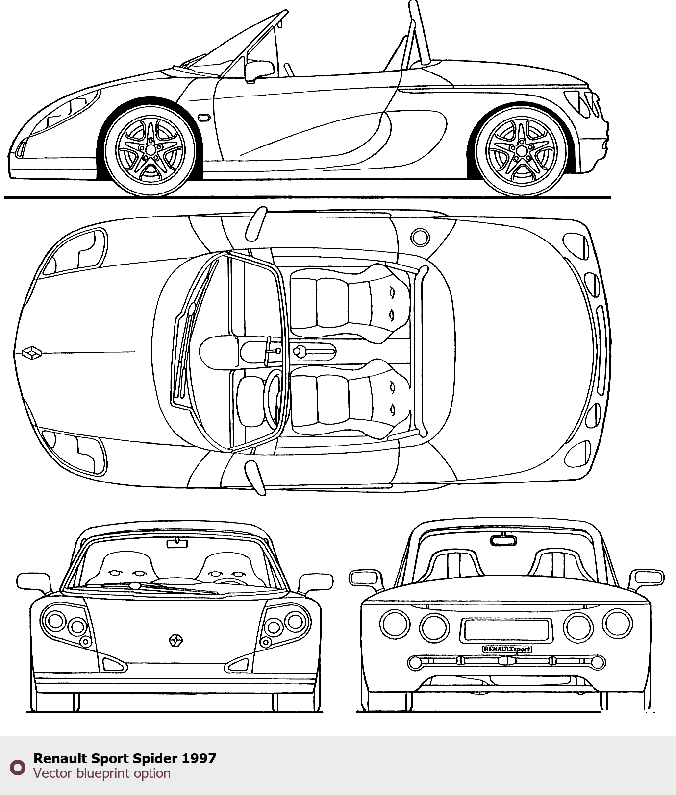 Raster blueprint of the 1997 Renault Sport Spider Roadster. This free downloadable image can be used for graphic projects, digital design, and 3D modeling. The file provides accurate exterior proportions of the vehicle. Model year: 1997. Body type: Roadster.