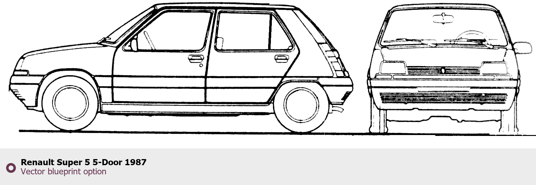 Raster blueprint of the 1987 Renault Super 5 5-Door Sedan. This free downloadable image can be used for graphic projects, digital design, and 3D modeling. The file provides accurate exterior proportions of the vehicle. Model year: 1987. Body type: Sedan.