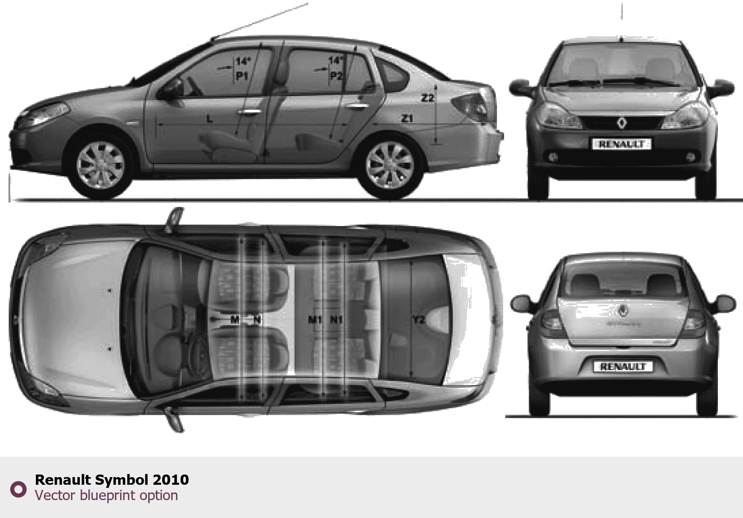 Raster blueprint of the 2010 Renault Symbol Sedan. This free downloadable image can be used for graphic projects, digital design, and 3D modeling. The file provides accurate exterior proportions of the vehicle. Model year: 2010. Body type: Sedan.