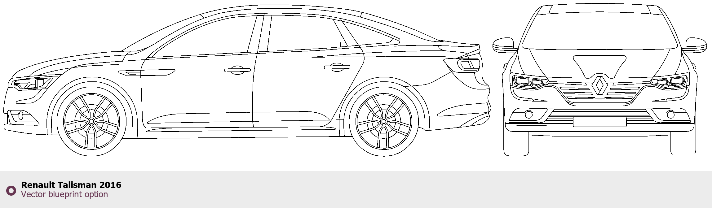 Raster blueprint of the 2016 Renault Talisman Tag. This free downloadable image can be used for graphic projects, digital design, and 3D modeling. The file provides accurate exterior proportions of the vehicle. Model year: 2016. Body type: Tag.