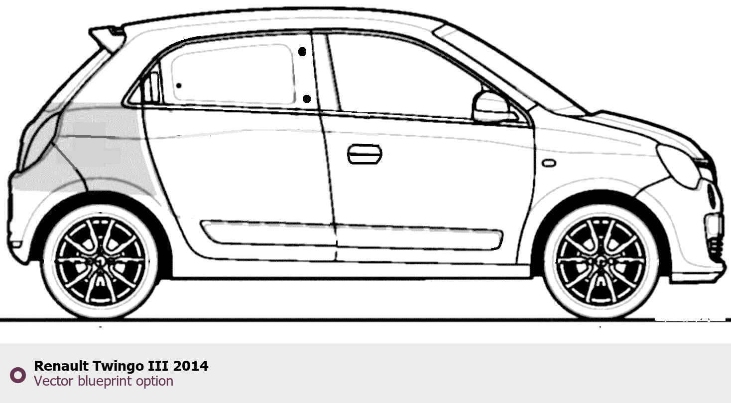 Raster blueprint of the 2014 Renault Twingo III Hatchback. This free downloadable image can be used for graphic projects, digital design, and 3D modeling. The file provides accurate exterior proportions of the vehicle. Model year: 2014. Body type: Hatchback.