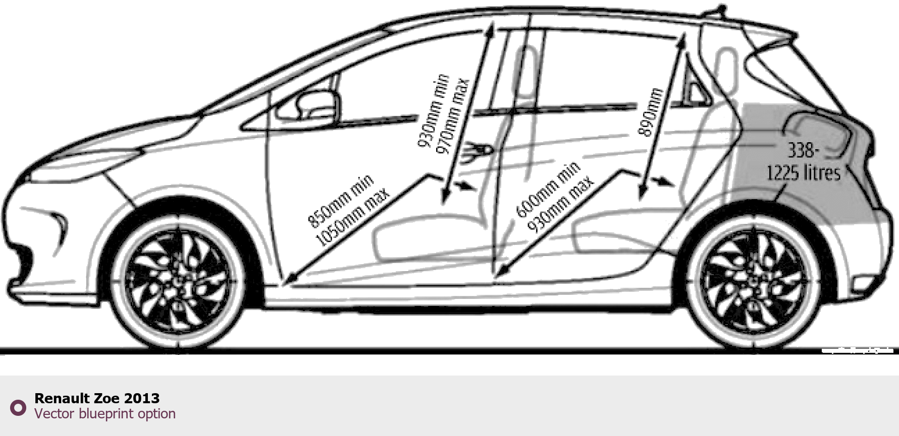 Raster blueprint of the 2013 Renault Zoe Hatchback. This free downloadable image can be used for graphic projects, digital design, and 3D modeling. The file provides accurate exterior proportions of the vehicle. Model year: 2013. Body type: Hatchback.