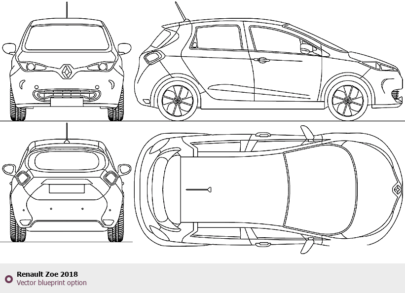 Raster blueprint of the 2018 Renault Zoe Hatchback. This free downloadable image can be used for graphic projects, digital design, and 3D modeling. The file provides accurate exterior proportions of the vehicle. Model year: 2018. Body type: Hatchback.