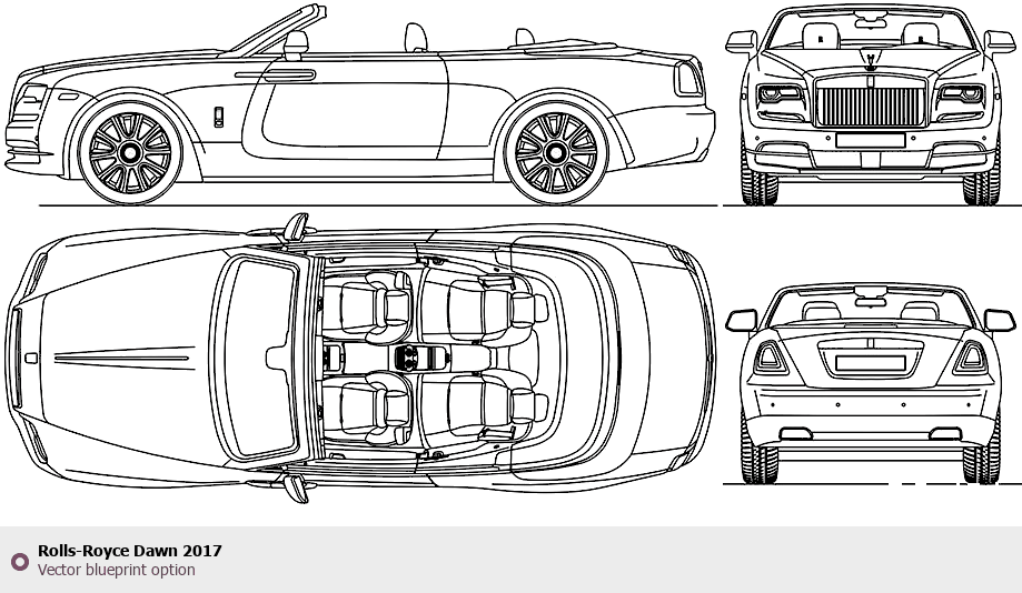 Raster blueprint of the 2017 Rolls-Royce Dawn Cabriolet. This free downloadable image can be used for graphic projects, digital design, and 3D modeling. The file provides accurate exterior proportions of the vehicle. Model year: 2017. Body type: Cabriolet.