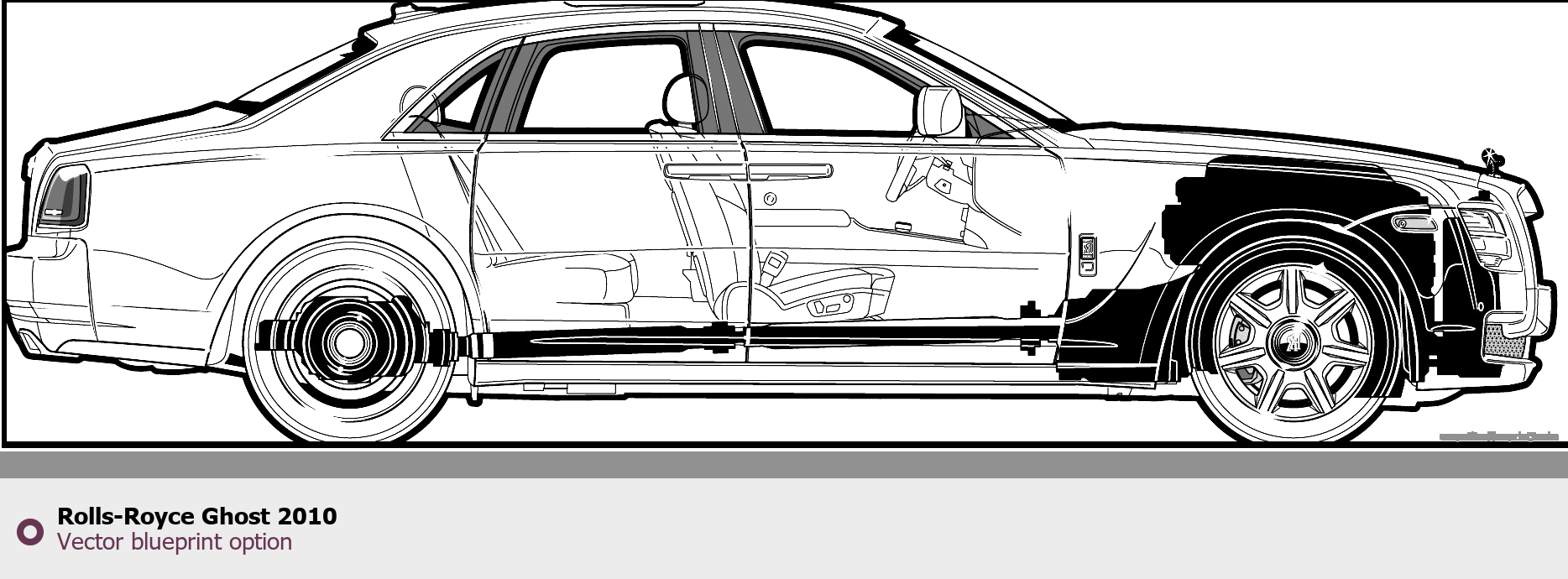 Raster blueprint of the 2010 Rolls-Royce Ghost Sedan. This free downloadable image can be used for graphic projects, digital design, and 3D modeling. The file provides accurate exterior proportions of the vehicle. Model year: 2010. Body type: Sedan.