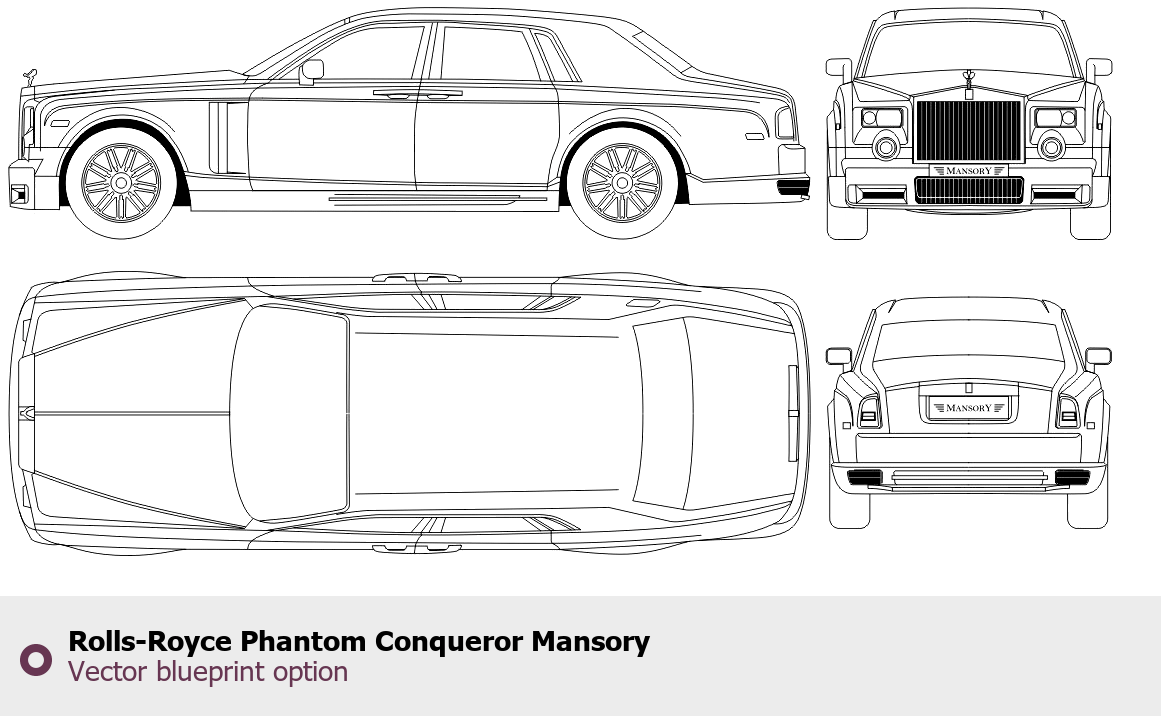 Raster blueprint of the Rolls-Royce Phantom Conqueror Mansory Limousine. This free downloadable image can be used for graphic projects, digital design, and 3D modeling. The file provides accurate exterior proportions of the vehicle. Body type: Limousine.
