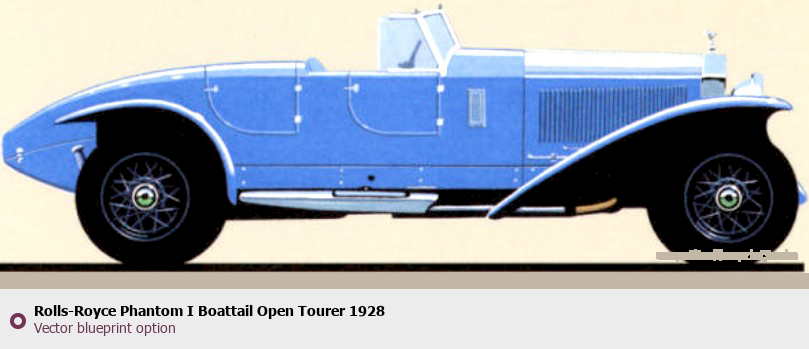 Raster blueprint of the 1928 Rolls-Royce Phantom I Boattail Open Tourer Limousine. This free downloadable image can be used for graphic projects, digital design, and 3D modeling. The file provides accurate exterior proportions of the vehicle. Model year: 1928. Body type: Limousine.