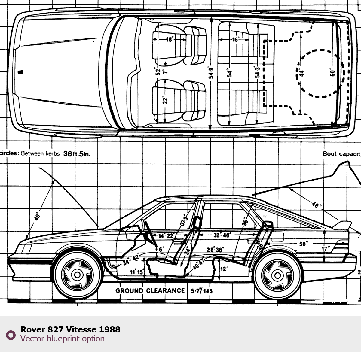 Raster blueprint of the 1988 Rover 827 Vitesse Tag. This free downloadable image can be used for graphic projects, digital design, and 3D modeling. The file provides accurate exterior proportions of the vehicle. Model year: 1988. Body type: Tag.