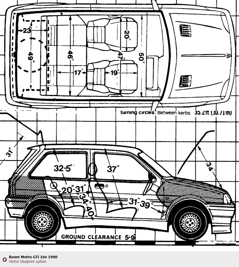 Raster blueprint of the 1990 Rover Metro GTi 16v Tag. This free downloadable image can be used for graphic projects, digital design, and 3D modeling. The file provides accurate exterior proportions of the vehicle. Model year: 1990. Body type: Tag.