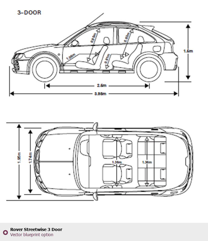 Raster blueprint of the Rover Streetwise 3 Door Hatchback. This free downloadable image can be used for graphic projects, digital design, and 3D modeling. The file provides accurate exterior proportions of the vehicle. Body type: Hatchback.