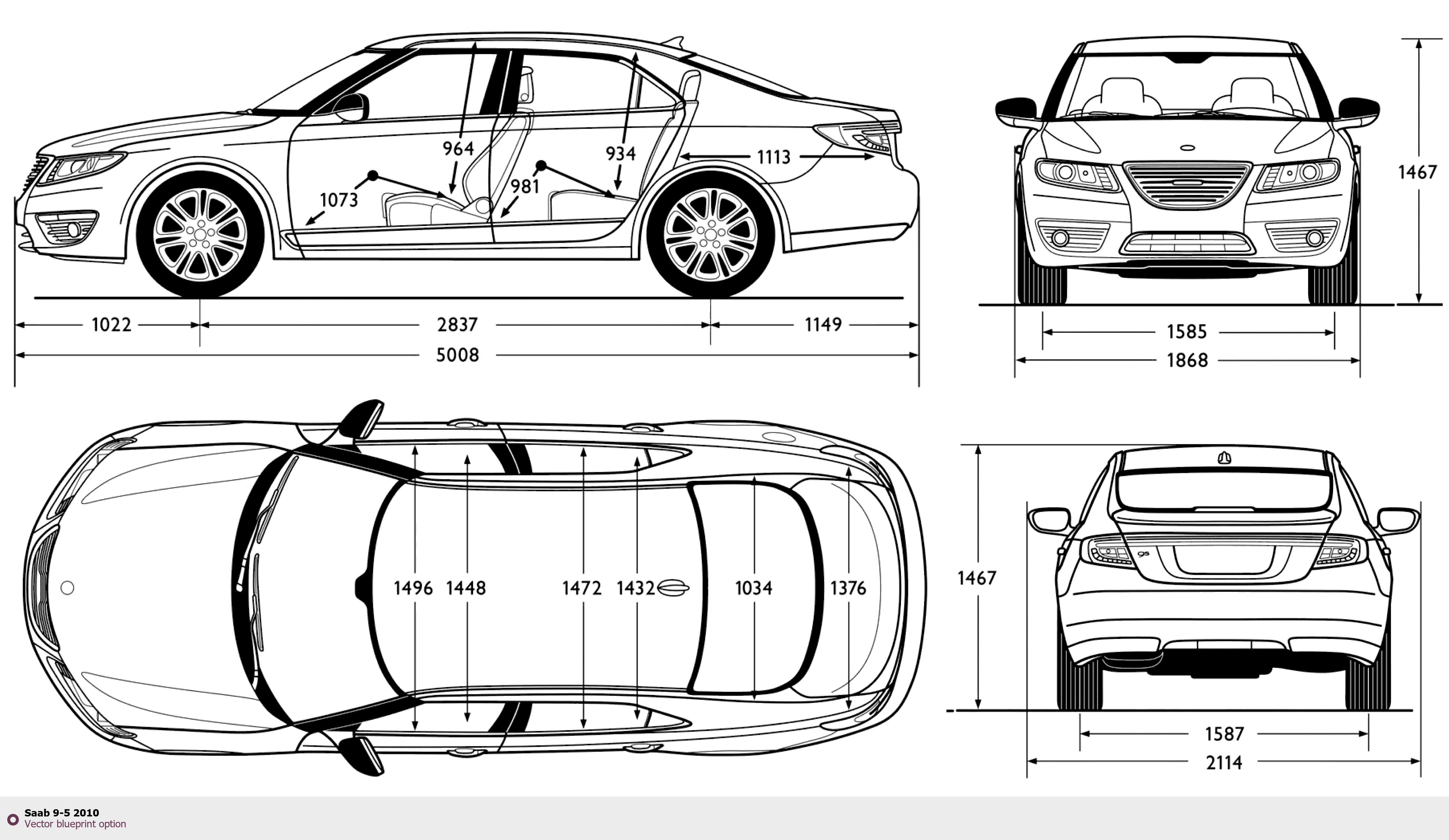 Raster blueprint of the 2010 Saab 9-5 Tag. This free downloadable image can be used for graphic projects, digital design, and 3D modeling. The file provides accurate exterior proportions of the vehicle. Model year: 2010. Body type: Tag.