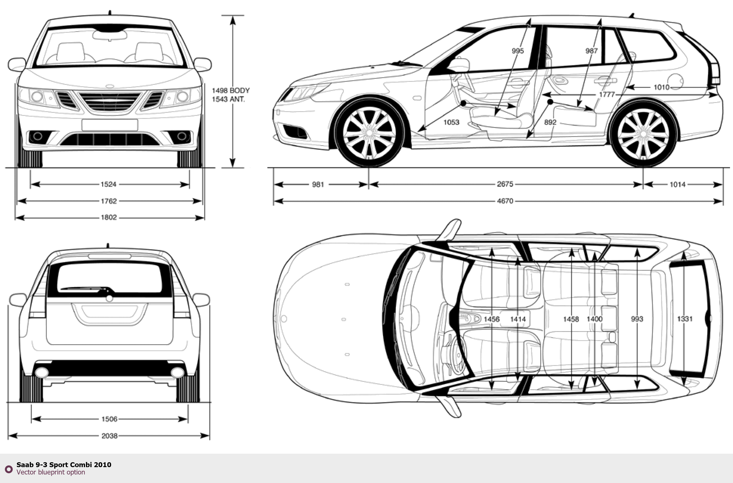 Raster blueprint of the 2010 Saab 9-3 Sport Combi Hatchback. This free downloadable image can be used for graphic projects, digital design, and 3D modeling. The file provides accurate exterior proportions of the vehicle. Model year: 2010. Body type: Hatchback.
