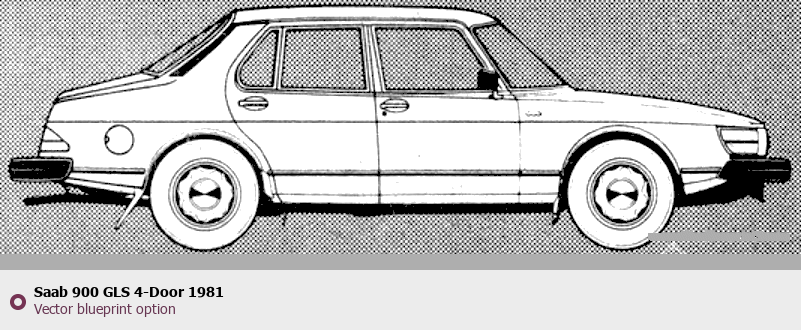 Raster blueprint of the 1981 Saab 900 GLS 4-Door Tag. This free downloadable image can be used for graphic projects, digital design, and 3D modeling. The file provides accurate exterior proportions of the vehicle. Model year: 1981. Body type: Tag.