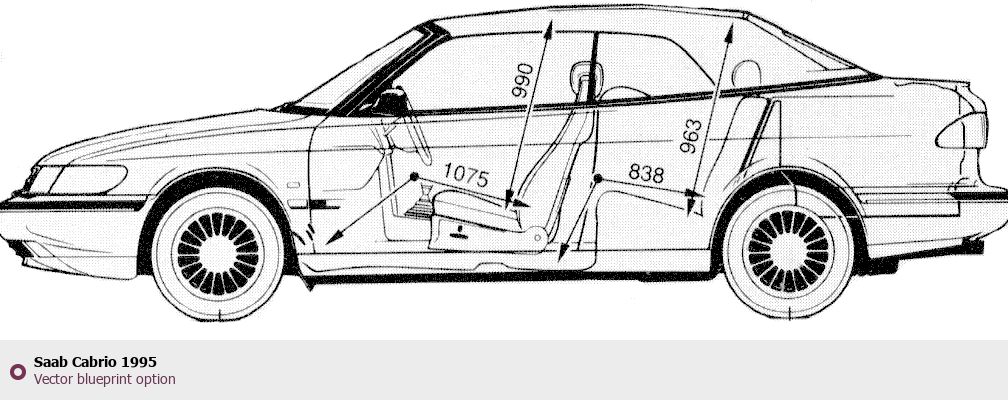 Raster blueprint of the 1995 Saab Cabrio Cabriolet. This free downloadable image can be used for graphic projects, digital design, and 3D modeling. The file provides accurate exterior proportions of the vehicle. Model year: 1995. Body type: Cabriolet.