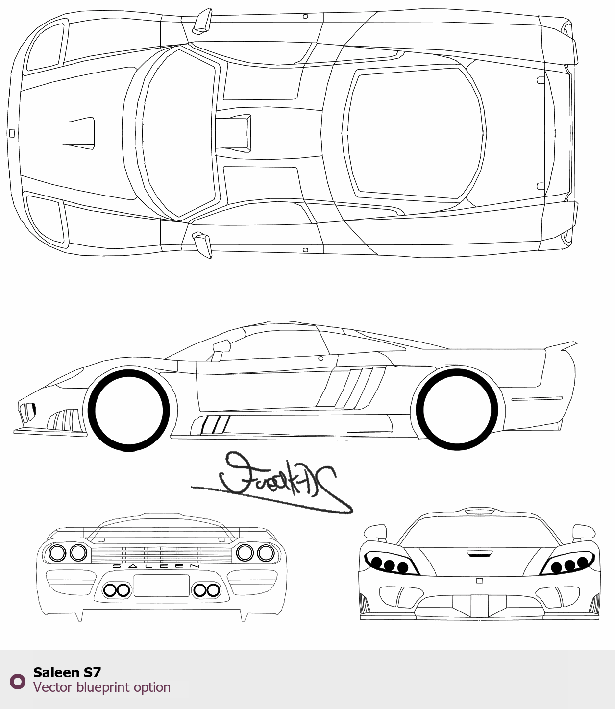 Raster blueprint of the Saleen S7 Coupe. This free downloadable image can be used for graphic projects, digital design, and 3D modeling. The file provides accurate exterior proportions of the vehicle. Body type: Coupe.
