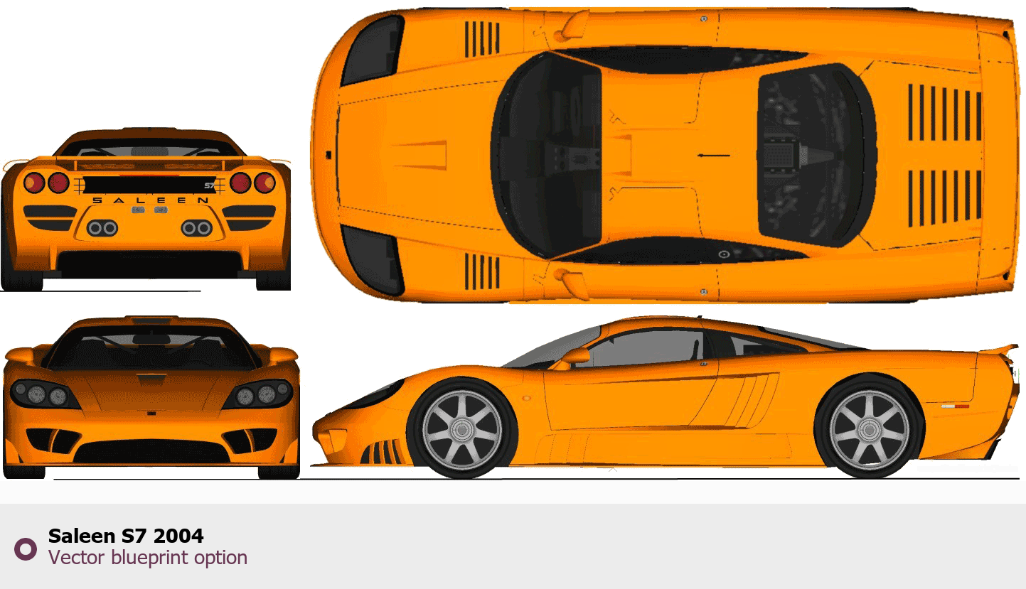 Raster blueprint of the 2004 Saleen S7 Coupe. This free downloadable image can be used for graphic projects, digital design, and 3D modeling. The file provides accurate exterior proportions of the vehicle. Model year: 2004. Body type: Coupe.