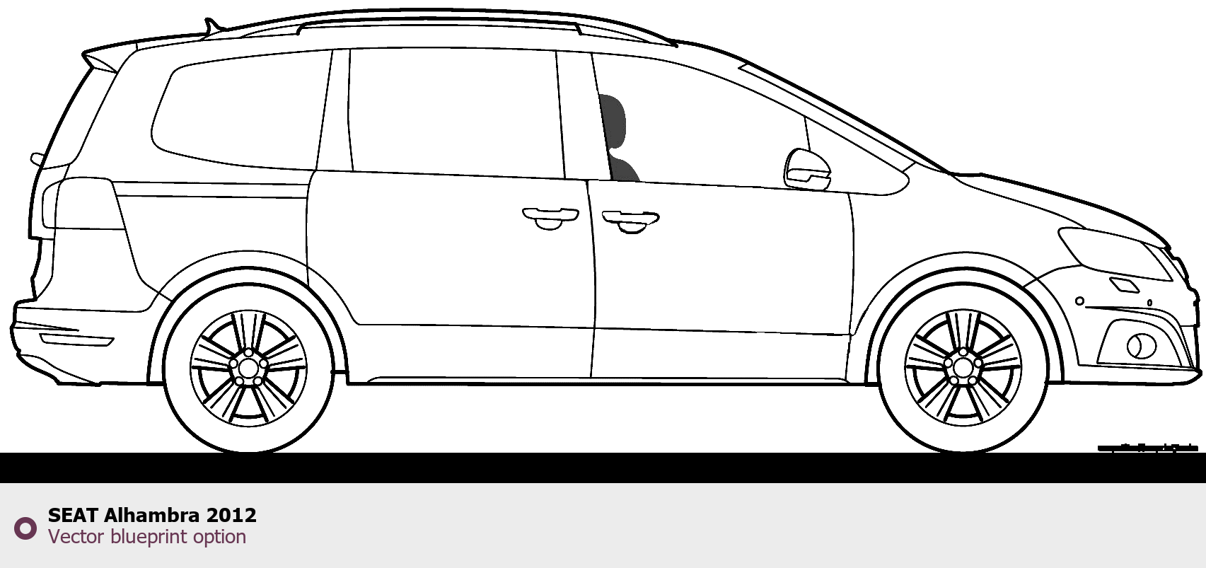 Raster blueprint of the 2012 Seat Alhambra Tag. This free downloadable image can be used for graphic projects, digital design, and 3D modeling. The file provides accurate exterior proportions of the vehicle. Model year: 2012. Body type: Tag.
