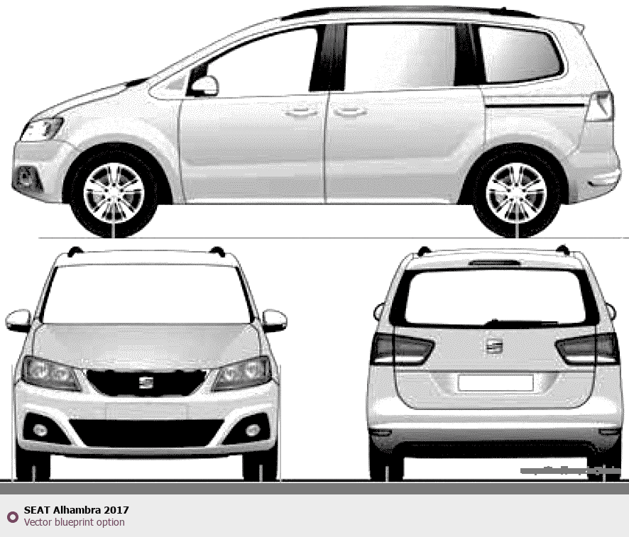 Raster blueprint of the 2017 Seat Alhambra Tag. This free downloadable image can be used for graphic projects, digital design, and 3D modeling. The file provides accurate exterior proportions of the vehicle. Model year: 2017. Body type: Tag.