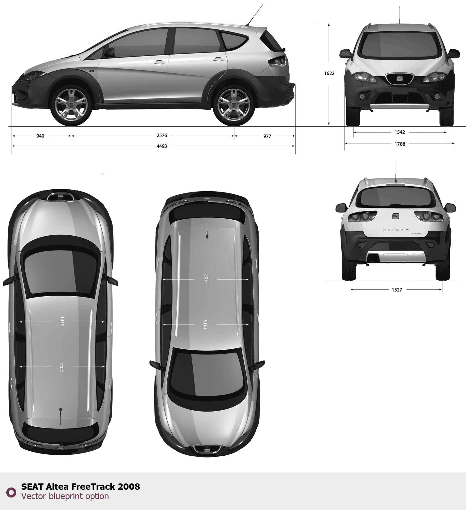 Raster blueprint of the 2008 Seat Altea FreeTrack Tag. This free downloadable image can be used for graphic projects, digital design, and 3D modeling. The file provides accurate exterior proportions of the vehicle. Model year: 2008. Body type: Tag.