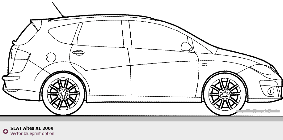 Raster blueprint of the 2009 Seat Altea XL Tag. This free downloadable image can be used for graphic projects, digital design, and 3D modeling. The file provides accurate exterior proportions of the vehicle. Model year: 2009. Body type: Tag.