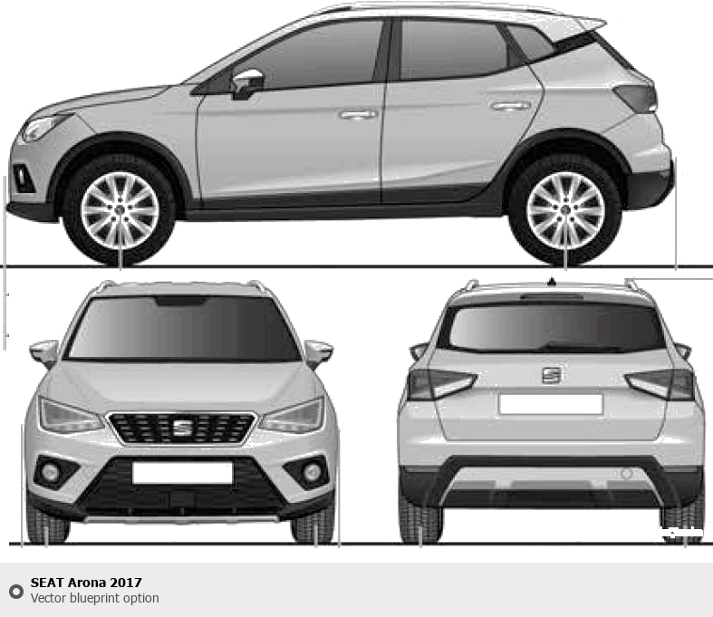 Raster blueprint of the 2017 Seat Arona Tag. This free downloadable image can be used for graphic projects, digital design, and 3D modeling. The file provides accurate exterior proportions of the vehicle. Model year: 2017. Body type: Tag.