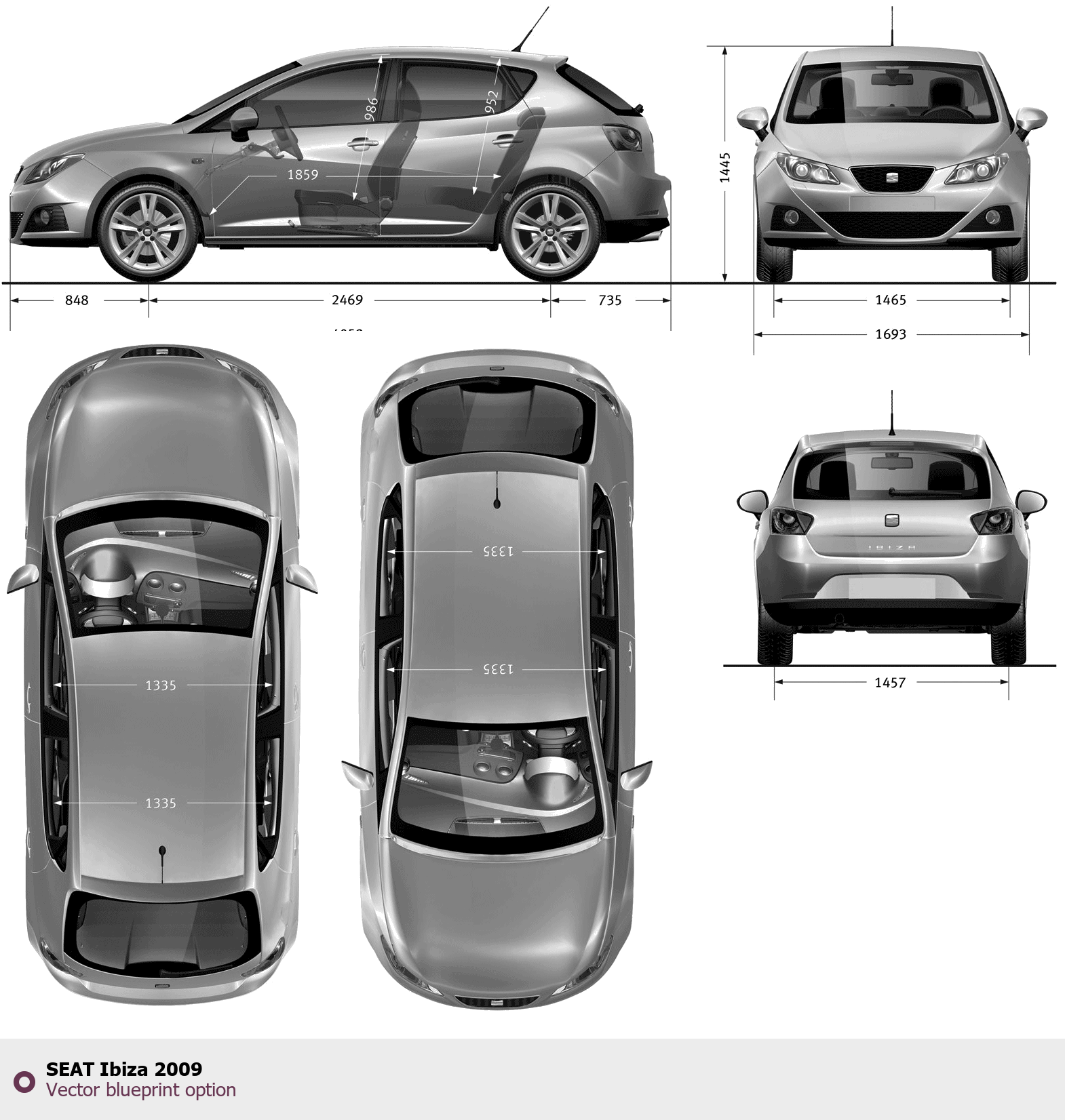 Raster blueprint of the 2009 Seat Ibiza Tag. This free downloadable image can be used for graphic projects, digital design, and 3D modeling. The file provides accurate exterior proportions of the vehicle. Model year: 2009. Body type: Tag.