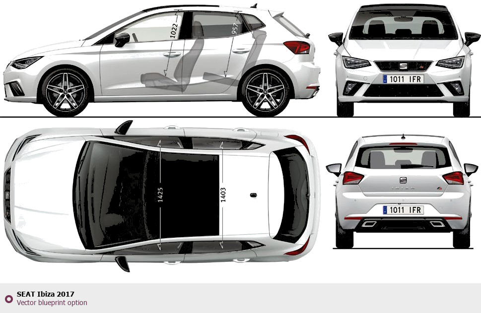 Raster blueprint of the 2017 Seat Ibiza Tag. This free downloadable image can be used for graphic projects, digital design, and 3D modeling. The file provides accurate exterior proportions of the vehicle. Model year: 2017. Body type: Tag.