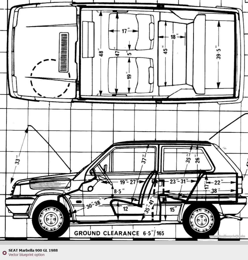Raster blueprint of the 1988 Seat Marbella 900 GL Tag. This free downloadable image can be used for graphic projects, digital design, and 3D modeling. The file provides accurate exterior proportions of the vehicle. Model year: 1988. Body type: Tag.