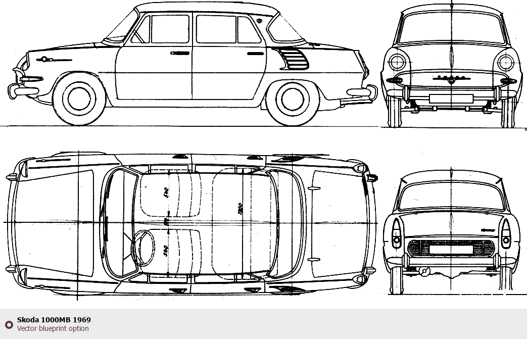 Raster blueprint of the 1969 Skoda 1000MB Tag. This free downloadable image can be used for graphic projects, digital design, and 3D modeling. The file provides accurate exterior proportions of the vehicle. Model year: 1969. Body type: Tag.
