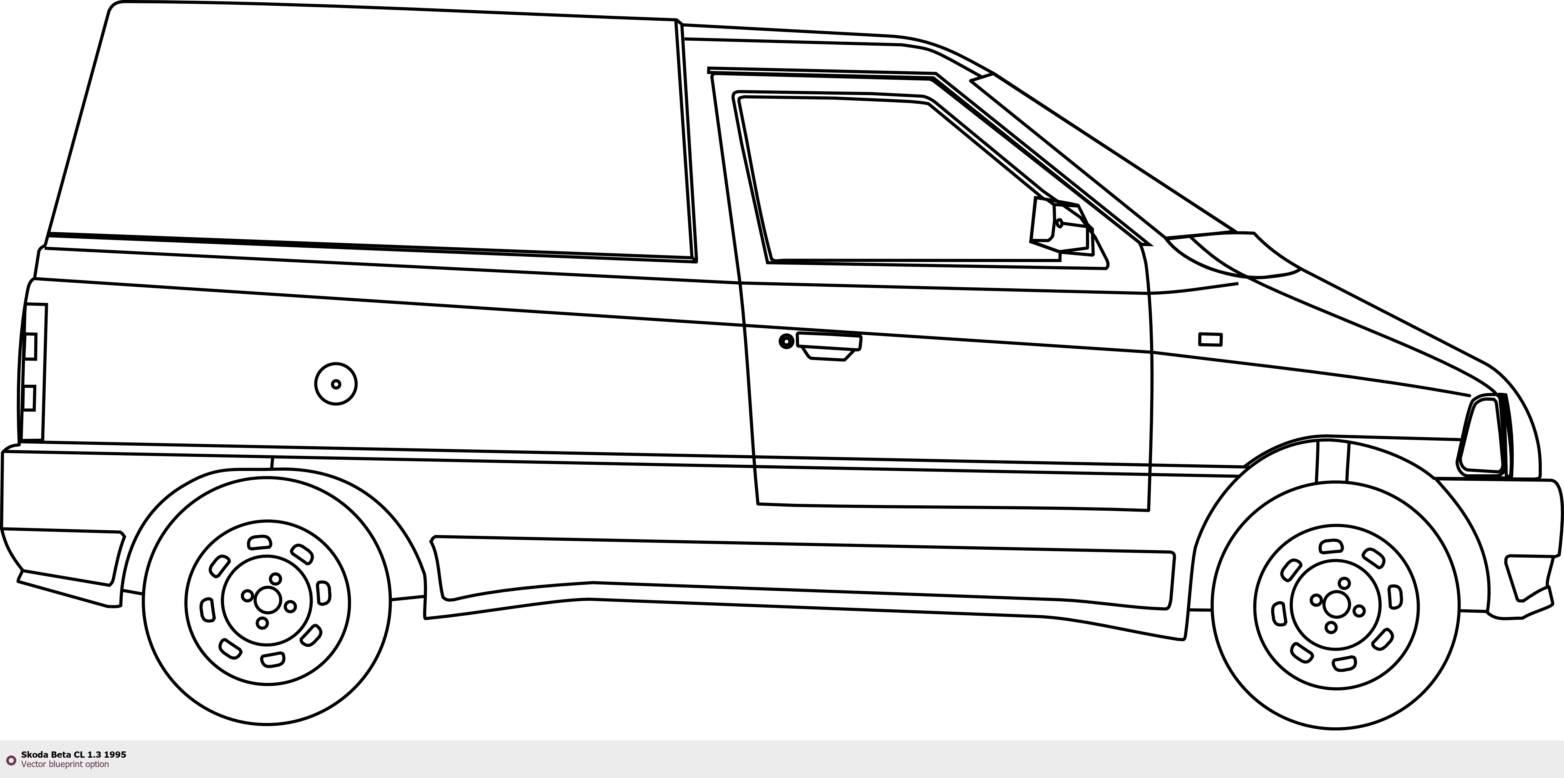 Raster blueprint of the 1995 Skoda Beta CL 1.3 Tag. This free downloadable image can be used for graphic projects, digital design, and 3D modeling. The file provides accurate exterior proportions of the vehicle. Model year: 1995. Body type: Tag.