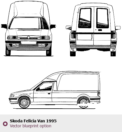 Raster blueprint of the 1995 Skoda Felicia Van Van. This free downloadable image can be used for graphic projects, digital design, and 3D modeling. The file provides accurate exterior proportions of the vehicle. Model year: 1995. Body type: Van.
