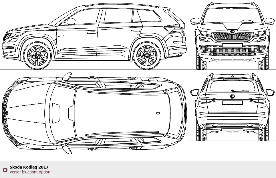 Raster blueprint of the 2017 Skoda Kodiaq SUV. This free downloadable image can be used for graphic projects, digital design, and 3D modeling. The file provides accurate exterior proportions of the vehicle. Model year: 2017. Body type: SUV.