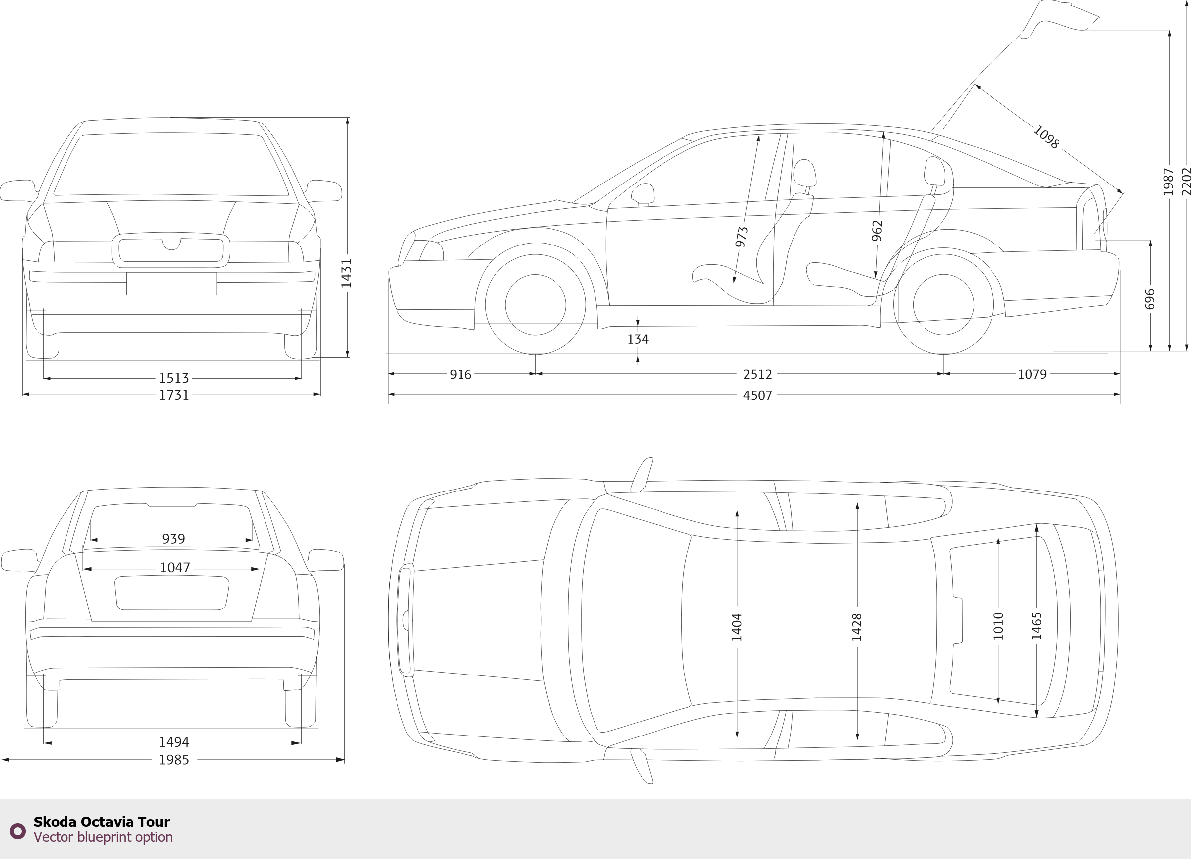 Raster blueprint of the Skoda Octavia Tour Tag. This free downloadable image can be used for graphic projects, digital design, and 3D modeling. The file provides accurate exterior proportions of the vehicle. Body type: Tag.