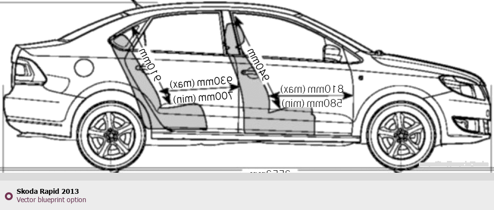 Raster blueprint of the 2013 Skoda Rapid Hatchback. This free downloadable image can be used for graphic projects, digital design, and 3D modeling. The file provides accurate exterior proportions of the vehicle. Model year: 2013. Body type: Hatchback.