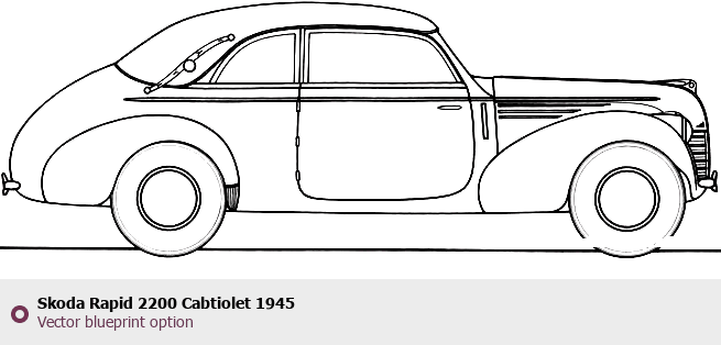 Raster blueprint of the 1945 Skoda Rapid 2200 Cabtiolet Hatchback. This free downloadable image can be used for graphic projects, digital design, and 3D modeling. The file provides accurate exterior proportions of the vehicle. Model year: 1945. Body type: Hatchback.