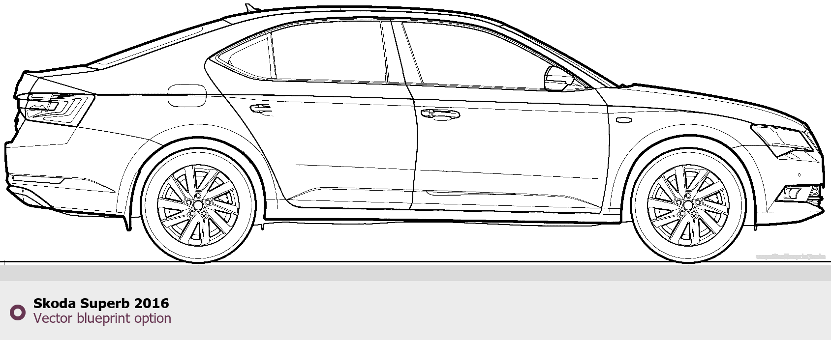 Raster blueprint of the 2016 Skoda Superb Tag. This free downloadable image can be used for graphic projects, digital design, and 3D modeling. The file provides accurate exterior proportions of the vehicle. Model year: 2016. Body type: Tag.