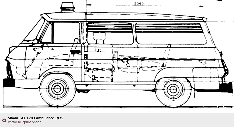 Raster blueprint of the 1975 Skoda TAZ 1203 Ambulance Hatchback. This free downloadable image can be used for graphic projects, digital design, and 3D modeling. The file provides accurate exterior proportions of the vehicle. Model year: 1975. Body type: Hatchback.